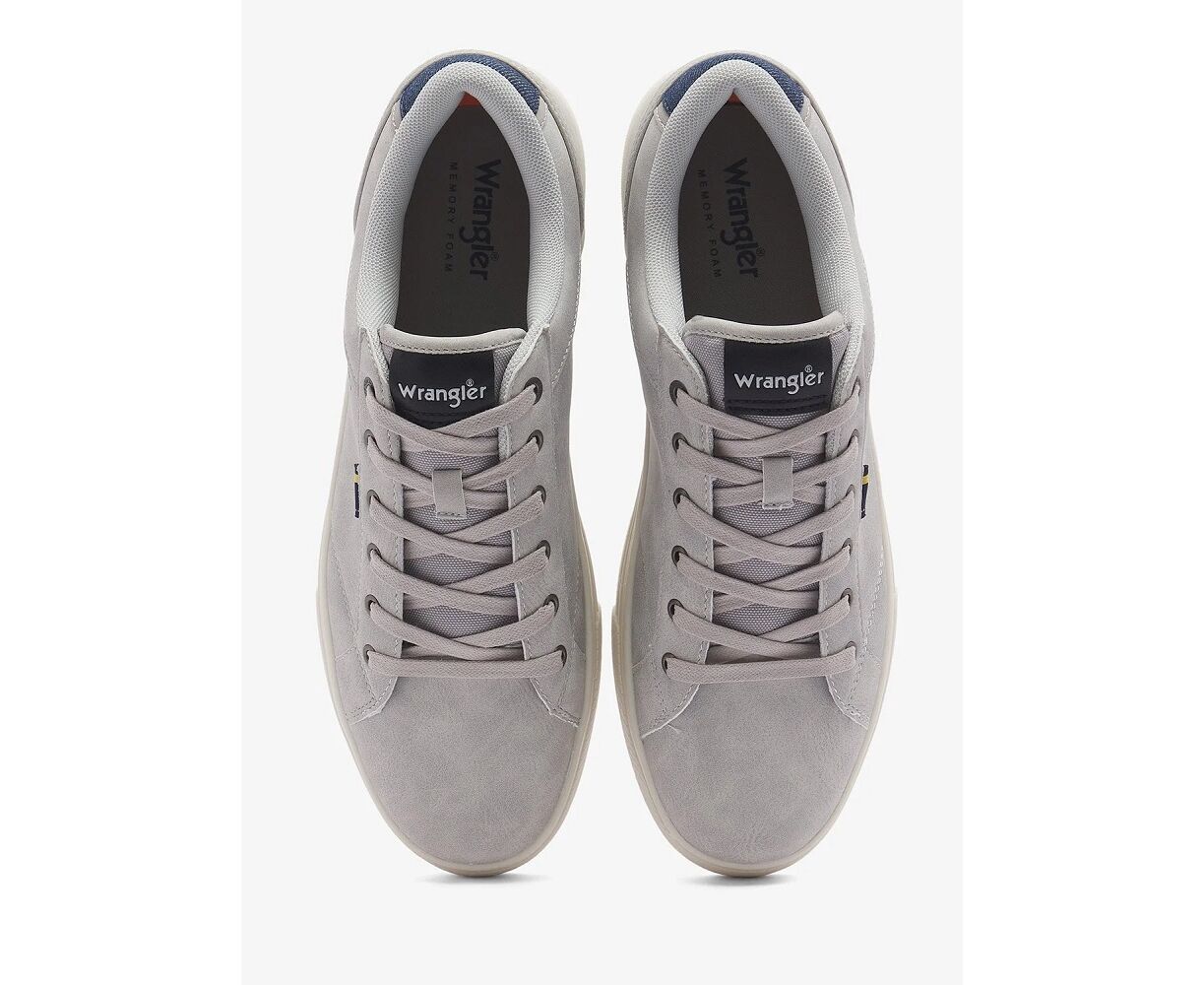 Ανδρικά sneakers Wrangler, σε γκρί χρώμα. Κατασκευασμένα από eco leather εξαιρετκής ποιότητας. Διαθέτουν την τεχνολογία Memory foam της εταιρείας Wrangler που παρέχει μαλακό και ελαφρύ πάτημα και ο εσωτερικός πάτος είναι αποσπώμενος για ευκολία στη χρήση. Πάτος αντιολισθητικός. Παπούτσια που δίνουν χαρακτήρα στο ντύσιμο σας με αυτοπεποίθηση και στυλ και θα σας συνοδεύσουν σε κάθε casual εμφάνιση σας. Διαθέτουν σόλα ύψους 4 cm και κορδόνια τα οποία εξασφαλίζουν την τέλεια εφαρμογή.