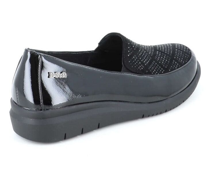 Γυναικεία παπουτσια B-Soft σε Μαύρο χρώμα, με δερμάτινο πάτο και λάστιχο στα πλαϊνά. Ένα ιδιαίτερα κομψό σχέδιο με strass που διαθέτει πολύ μαλακό δερμάτινο εσωτερικό πάτο και αντιολισθητική σόλα.