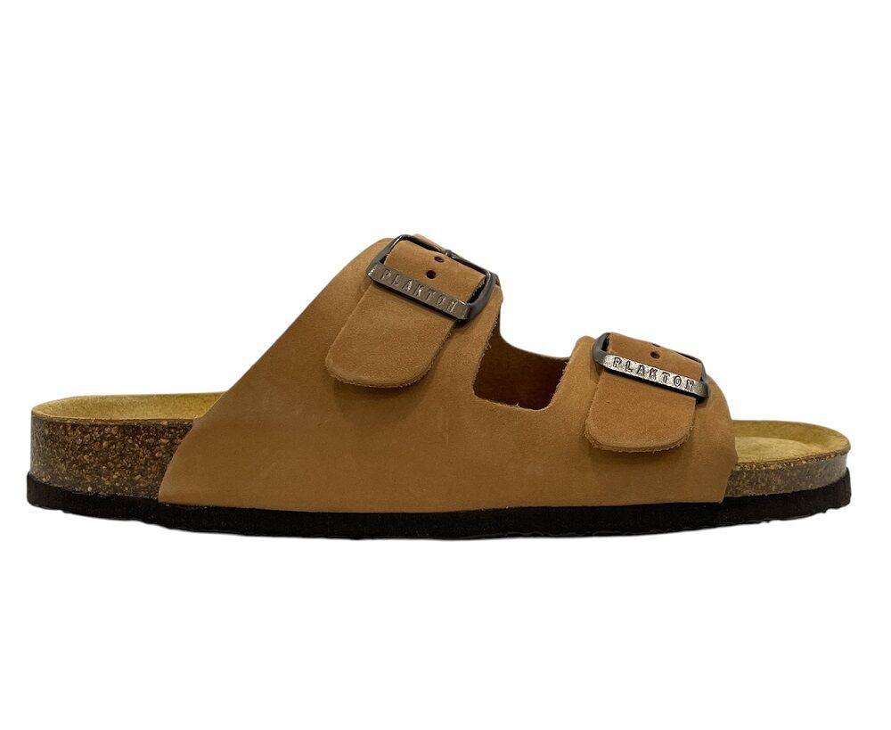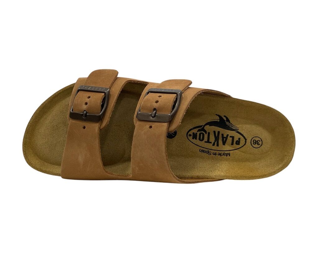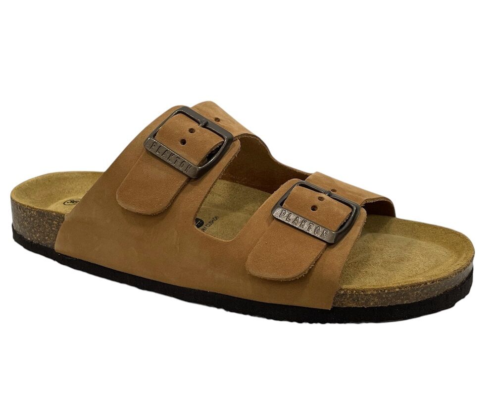 Ανατομικά σανδάλια PLAKTON  από δέρμα, Διαθέτει διπλό λουρί στο μπροστινό μέρος με λεπτομέρεια μεταλλικές αγκράφες.Ο ανατομικός πάτος από φυσικό φελλό, σε συνδυασμό με το εσωτερικό δερμάτινο πατάκι θα κάνει το βάδισμα σας ποιό άνετο.